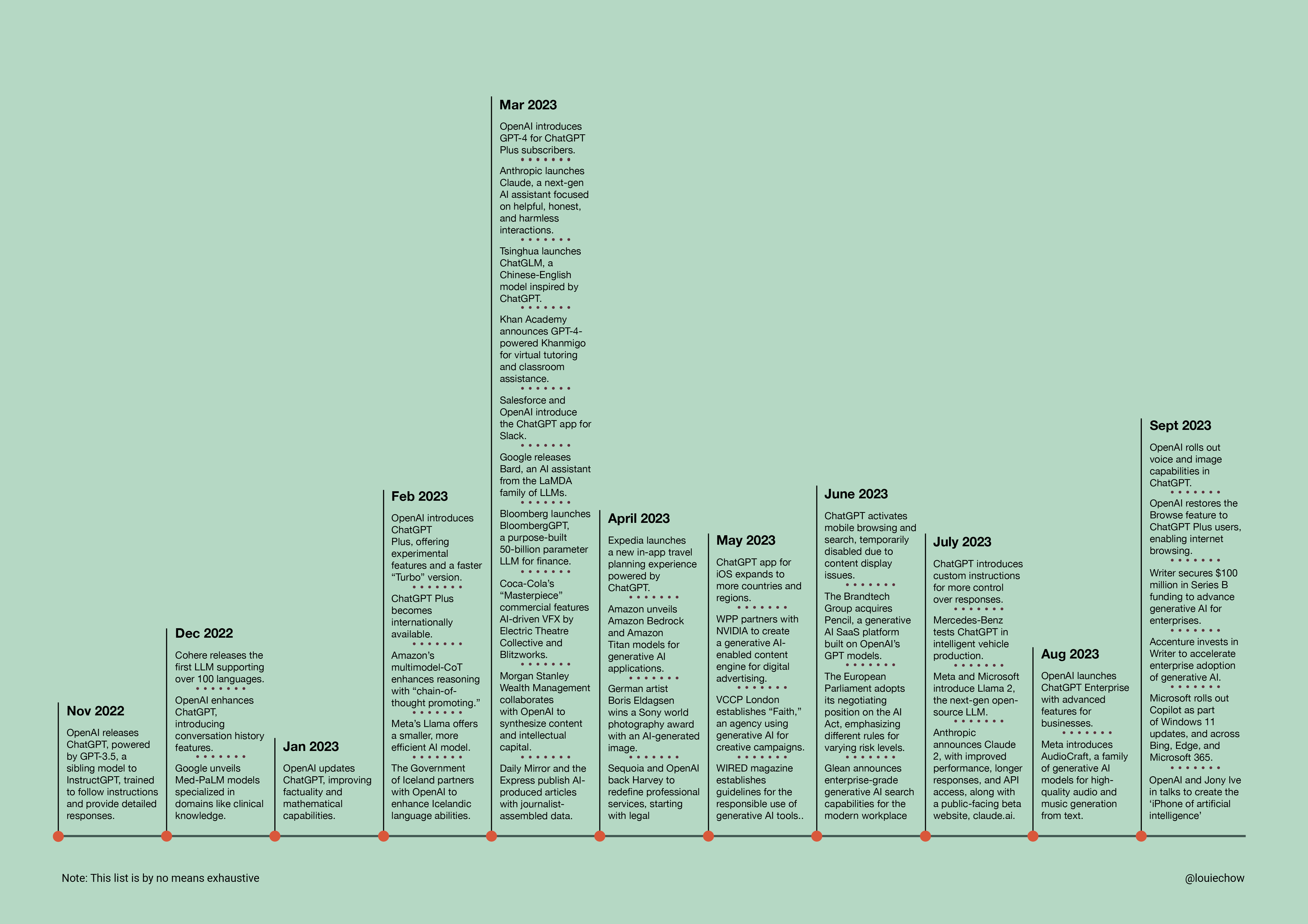 March – April: As the rapid development of Generative AI reached its zenith, companies across various sectors demonstrated a wide array of reactions. Tech giants like OpenAI and Meta continued to lead the charge with the introduction of GPT-4 and Llama 2, catering to both consumer and enterprise demands. Meanwhile, the Government of Iceland embraced this technology as a means to enhance the Icelandic language abilities, exemplifying how even governments are recognizing its potential. Coca-Cola launched new commercial entitled “Masterpiece”. The VFX team at Electric Theatre Collective and creative agency Blitzworks used a mix of live action shots, digital effects and AI to create the commercial and its complex transitions. In the corporate world, Morgan Stanley Wealth Management announced a strategic initiative to leverage Generative AI to synthesize content, underlining its increasing importance in the financial sector. Media outlets like the Daily Mirror and the Express ventured into AI-produced content, further blurring the lines between human and AI-generated journalism. Start-ups like Anthropic and Tsinghua joined the AI race, unveiling chatbots and models aimed at fostering helpful, honest, and efficient interactions. In education, Khan Academy‘s adoption of GPT-4 for Khanmigo emphasized AI’s role in revolutionizing learning. Expedia announced an exciting new use for artificial intelligence with the beta launch of a new in-app travel planning experience powered by ChatGPT. Finally, Bloomberg‘s launch of BloombergGPT in finance highlighted how industries are building purpose-built models to cater to their unique needs. These diverse reactions demonstrate how Generative AI’s impact transcends boundaries, with companies both big and small, across various sectors, recognizing its transformative potential.